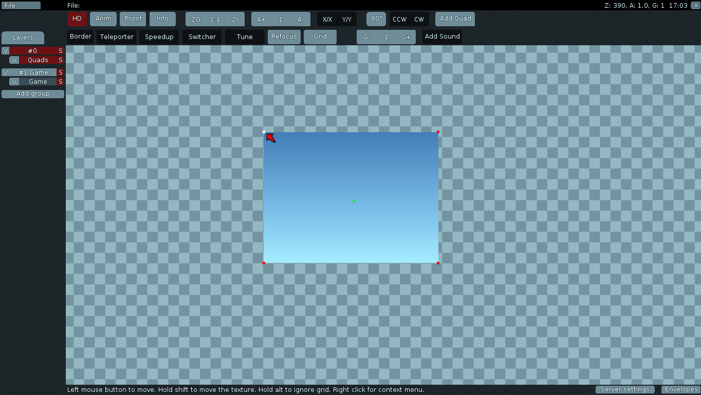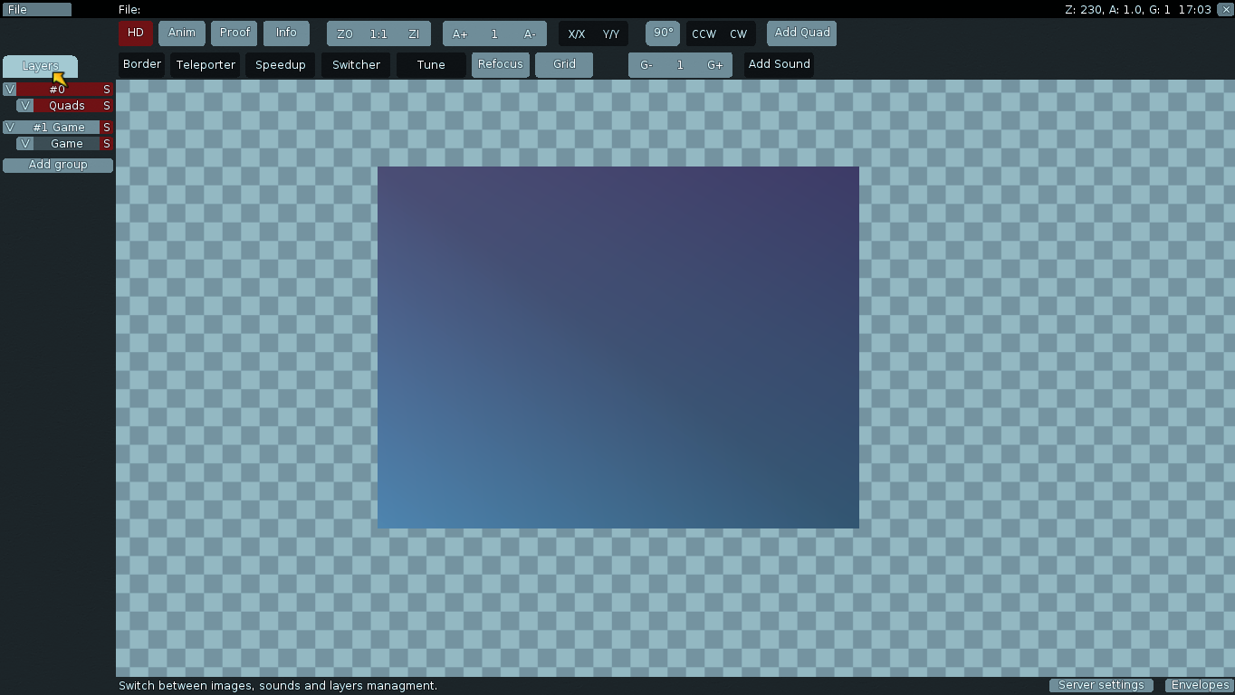 Here I would like to show you the basics of teeworlds mapping. This tutorial is aimed to beginners, who have no idea how map editor works. Follow it and you will quickly learn your first steps. Let's begin with opening the teeworlds map editor. Just start Teeworlds and without joining any server press CTRL + SHIFT + E. Now you should see something like this.Video Tutorial by Aoe: https://www.youtube.com/watch?v=UXZnF17TgEQ