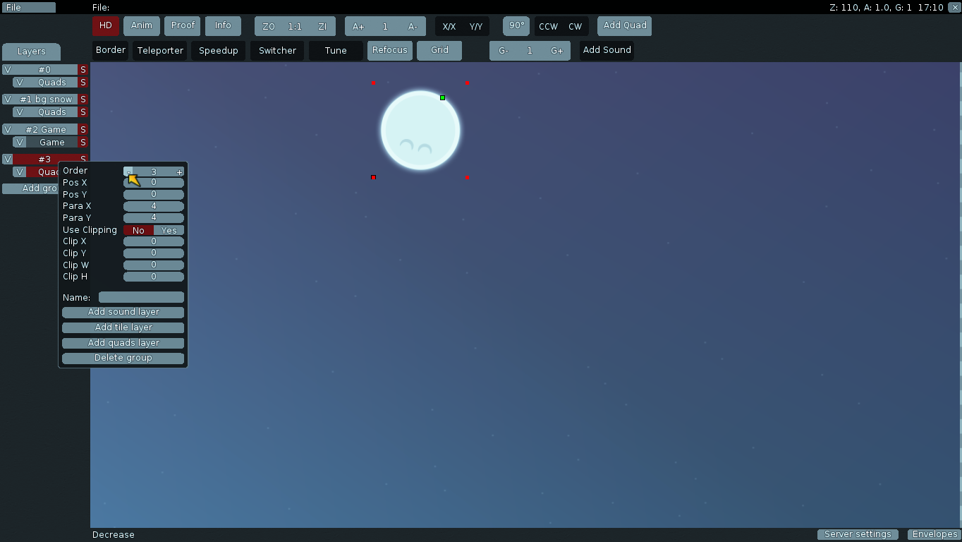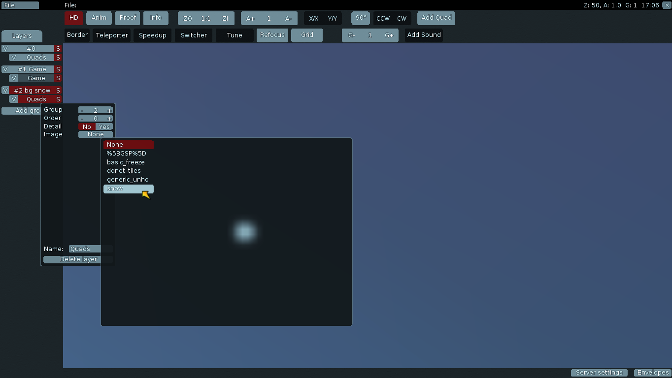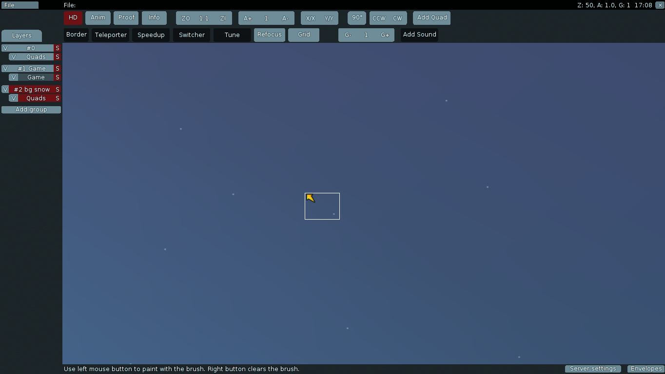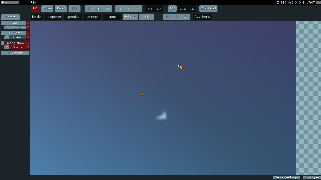 We've choosen the first layer called "0". Right click on one of these red squares, now you can edit colour of background of your map. (I'm using new DDnet Client version, and that makes mapping easier)