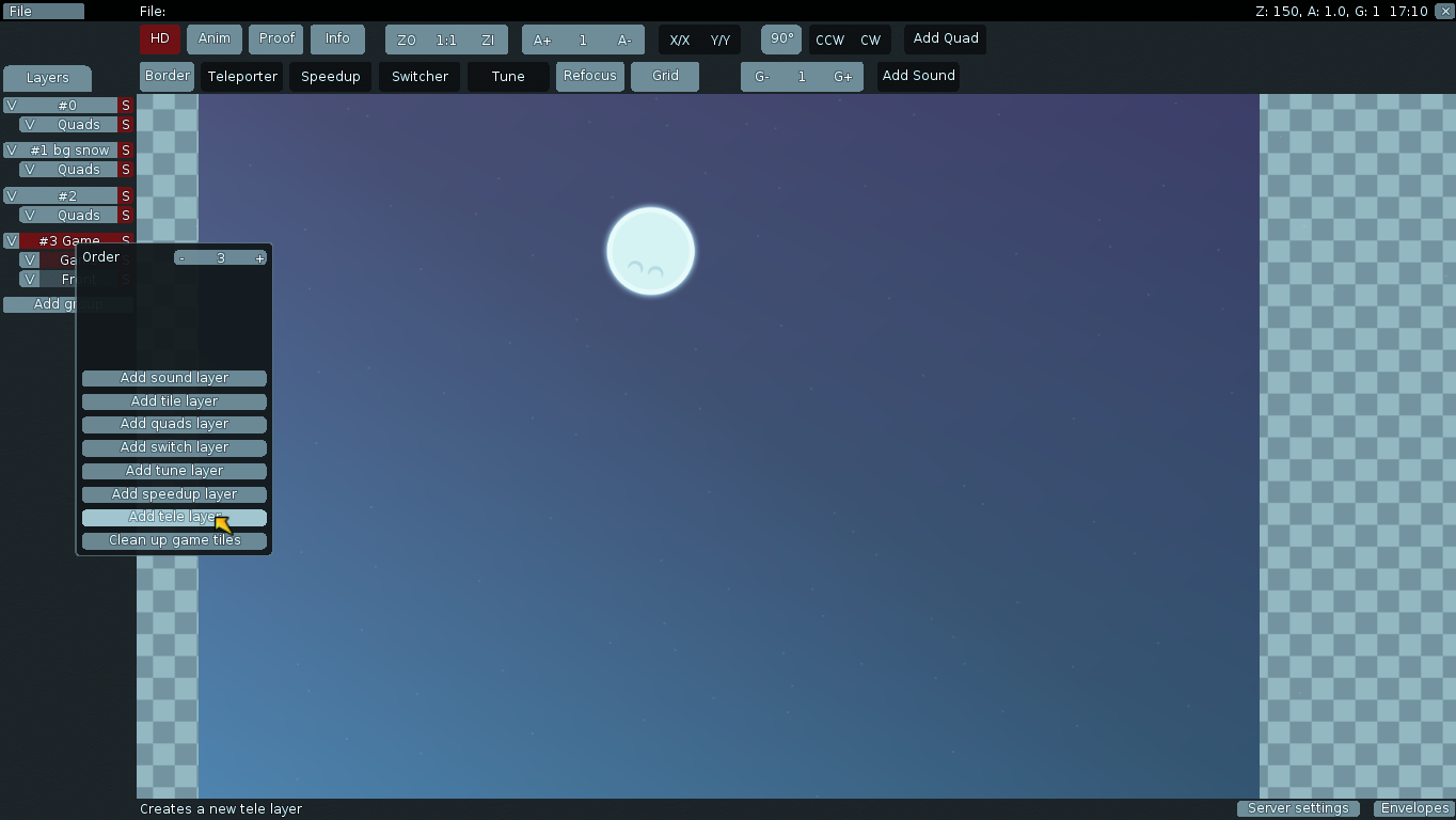 Right click on "Game", now you can add "tune", "teleport", "front"...layer. + Tiles